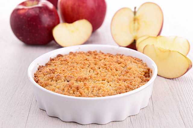 2 pommes, 2 poires, 1 grappe de raisin muscat, 80 g de farine, 6 noix, 80 g de beurre, 80 g de sucre, 80 g de muesli, 1 pincée de sel.