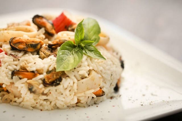 Faites ouvrir 1 kg de moules avec 1 dl de vin blanc sec, sel, poivre, thym, laurier, oignon, céleri. Faites revenir à l'huile 1 oignon haché, ajoutez 1 tasse 1/2 de riz, remuez 2 mn. Mouillez de 3 tasses de liquide (bouillon + jus filtré des moules), joignez une capsule de safran. Laissez cuire 20 mn, ajoutez les moules décoquillées.