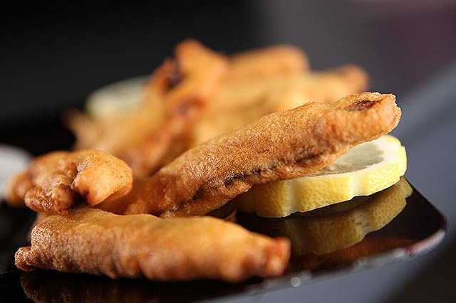 Pour 6 personnes: 1/2 kg de sardines fraîches, 1 oignon, 1 cuillerée à café d'origan, 1 pincée de sel, 1/2 cuillerée à café de purée de piment, 1 filet d'huile d'olive, 1 bol de farine, 3 oeufs, 1 citron, huile spéciale friture.