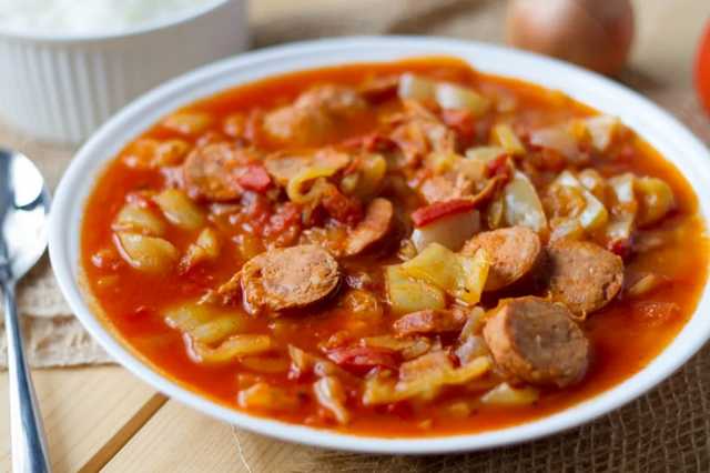 Faire rissoler des oignons à la graisse. Y ajouter des piments verts et des tomates en dés, 150 g de saucisse fumée en rondelles et faire étuver une demi-heure. Au moment de servir rectifier l'assaisonnement avec du poivre ou du paprika et ajouter trois oeufs crus. Mêler jusqu'au durcissement des oeufs.