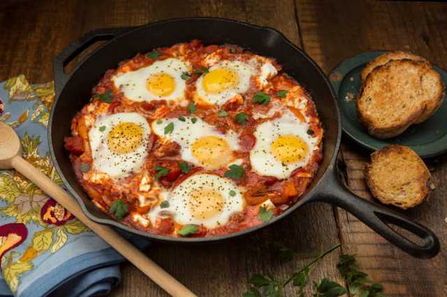 Faire revenir à l'huile d'olive quatre oignons émincés, quelques pommes de terre et autant de tomates, deux piments doux et un piment fort. Laisser Cuire. Une fois cuits, ajouter des petites saucisses de mouton dites merguez. Une fois dorées, casser dessus un oeuf entier par personne et servir moelleux.