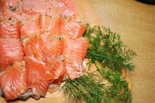 Pour 4 personnes: 600 g de filet de saumon tranché finement, 4 brins d'aneth, 4 brins de cerfeuil, 4 c à soupe d'huile d'olive, 2 c à soupe de poivre vert, le jus de 2 citrons, sel.