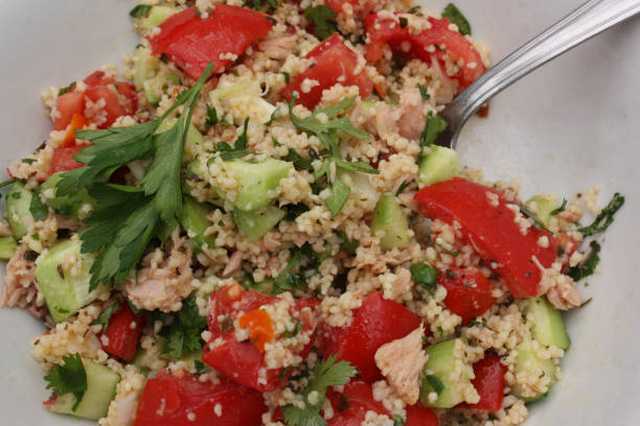 Pour 6 personnes. Préparation: 20 mn. Attente 2 h 30. 200 g de bulghur fin (ou bien de couscous moyen), 500 g de tomates, 1 petit concombre, 200 g de thon en boîte au naturel, 2 citrons, 1 échalote nouvelles, 1 bouquet de coriandre, 1 bouquet de menthe fraîche, 6 ouillères à soupe d'huile d'olive, sel, poivre.