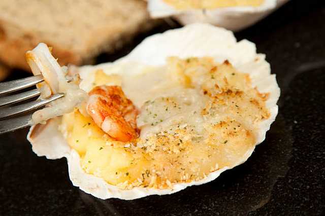 Faire fondre la moitié du beurre dans une sauteuse et y faire revenir l'échalote et l'oignon hachés. Ajouter les noix et le corail et les dorer à leur tour. Mouiller avec le vin, mélanger, saupoudrer de mie de pain, de persil haché, saler, poivrer et laisser cuire 8 à 10 mn afin d'obtenir une sauce légère. Garnissez chaque coquille, arrosez de beurre fondu et d'un petit filet d'huile d'olive, saupoudrez de chapelure et faites gratiner au four 15 mn.