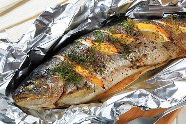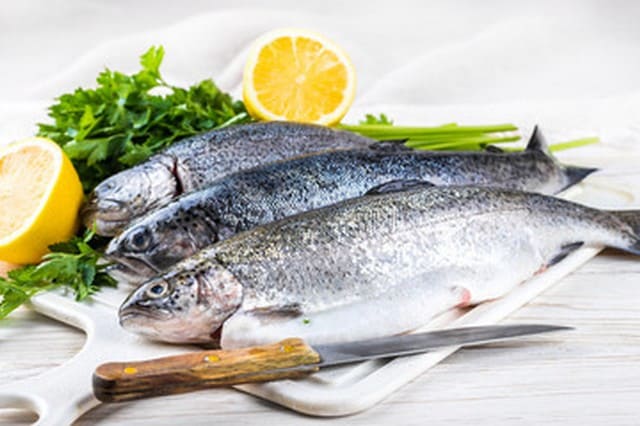 Faire une farce avec du jambon frais, des champignons de Paris, persil, ciboulette, échalotes et une pointe d'ail, saler, poivrer le tout haché très fin et revenu dans du beurre sans brunir. A cette farce on ajoutera un oeuf entier battu, mélangé hors du feu, et un peu de vin blanc. Farcir les truites, les coudre, puis les placer dans un plat beurré; saler et poivrer à nouveau et recouvrir d'un papier bien huilé. Apres un quart d'heure à four vif enlever le papier afin de dorer les truites pendant quelques minutes. Décorer de lamelles de jambon cru et des dés de lard sur croûtons frits.