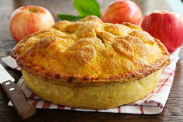 Etendre la moitié de la pâte dans la tourtière. Mettre les pommes émincées à tremper dans un peu d’eau additionnée de jus de citron. Mélanger ensemble la farine, la cannelle, la muscade, le sucre, les zestes d’orange et de citron, et en saupoudrer un tiers sur le fond de la tarte. Puis disposer une couche de pommes ; saupoudrer encore un tiers du mélange ainsi que les raisins secs. Remettre une couche de pommes que vous saupoudrez du mélange restant ; recouvrir avec le reste de pâte. Faire cuire au four préchauffé à 200°C, 1 h.. Peut aussi se faire avec des poires ou des coings.