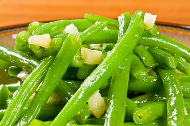 Equeutez et effilez les haricots verts. Lavez-les et cuisezles à la vapeur. Dans une poêle faire revenir l'ail puis ajoutez les haricots verts. Mélangez délicatement puis versez dans un plat à servir.