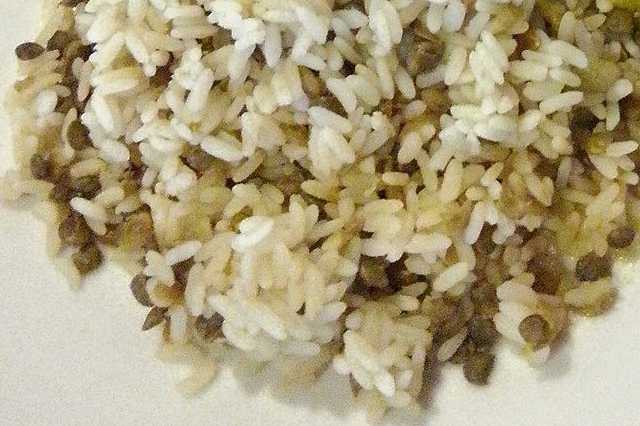 Cuire les lentilles et le riz séparément ; égoutter. Cuire les oignons rouges et l'ail 30 min à feu doux, dans l'huile et la margarine végétale jusqu'à ce qu'ils soient bien tendres, incorporer les épices et prolonger la cuisson de quelques min. Mélanger les oignons épicés avec le riz et les lentilles. Incorporer les oignons nouveaux, saler et poivrer. Servir chaud.