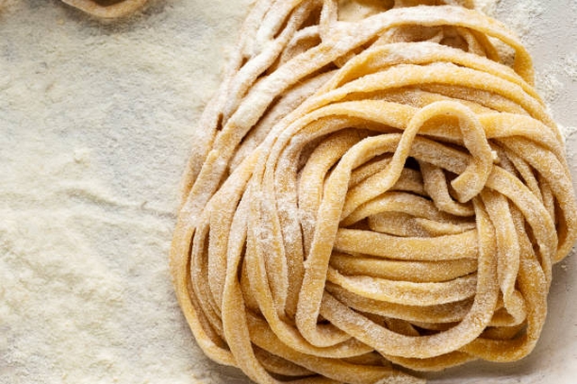 Dans un saladier ou dans le bol d'un robot versez la farine, l'huile et le sel. Bien mélanger. Sortez la pâte sur le plan de travail légèrement enfariné. Formez une boule et pétrissez-la plusieurs fois en repliant la pâte sur elle-même et en ajoutant un peu de farine si la pâte est trop collante. Laissez reposer au frais pendant 30 min. Etalez la pâte au rouleau pour obtenir une épaisseur de 0,5 cm. Roulez la pâte sur elle-même pour former un tube. Au couteau coupez des tranches fines de la largeur d'une nouille. Laissez un peu sécher les nouilles déroulées. Faites-les cuire dans une grande casserole d'eau bouillante légèrement salée. Assaisonnez selon goût avec : huile d'olive ; sauce tomate ; persil ; ail ; basilic ; beurre ; brisures de noix ; sauce aux champignons, etc.