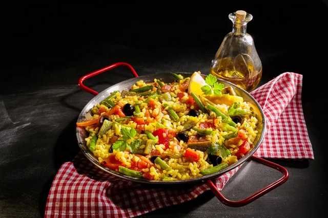 500g de tomates pelées et coupées en morceaux, 200g de haricots verts coupés en deux, 300g de petits pois écossés, 250g carottes coupées en dés, 10 petit oignons nouveaux, 250g de champignons de Paris émincés, 2 poivrons rouges coupés en fines lanières, 10 càs de riz complet long, 1 càs d’ail haché, 1 càs de persil haché, sel, 100g d’olives noires dénoyautées, safran, huile d’olive.