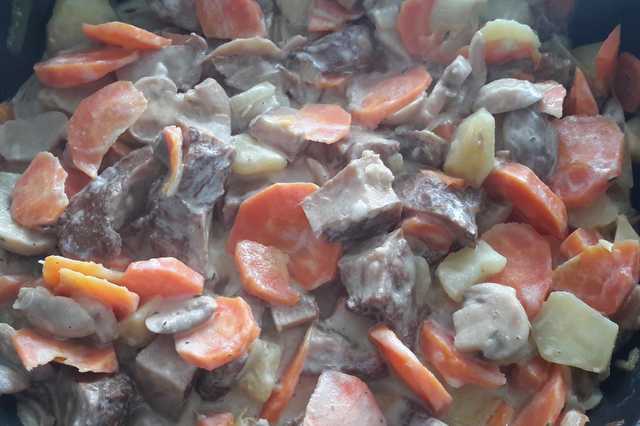 250g de seitan, 200g de champignons émincés, 4 carottes coupées en rondelles, 1 échalote hachée, 200mL de bouillon de légumes, crème ou lait de soja non sucré, fécule de maïs, huile d'arachide, sel, poivre.