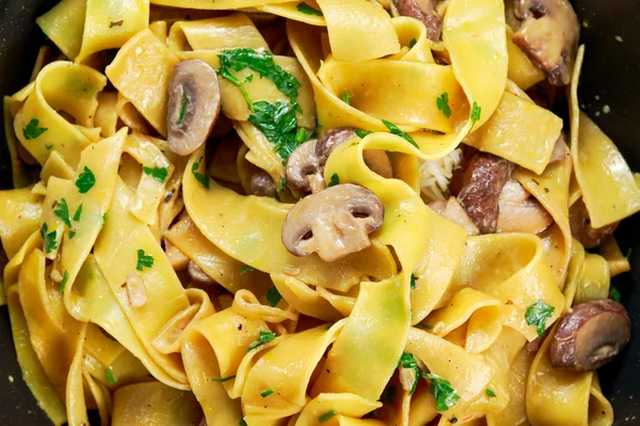 250g de champignons émincés, 1 gousse d’ail hachée, 1 oignon haché, 300mL de bouillon de légumes, 2 càs de farine, 30g de margarine végétale, sauce de soja, huile d’olive, curry, noix de muscade, poivre, persil haché, pâtes 100% à base de blé dur.
