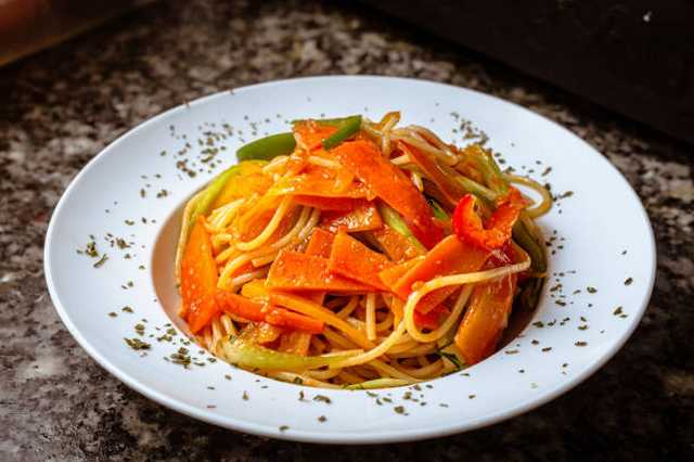 Rissoler l’ail dans une poêle, lui ajouter les poivrons taillés en fines lamelles et les épices, et laisser mijoter à couvert (de manière à conserver le jus des poivrons). Cuire les 14 pâtes selon les instructions du sachet et les mélanger ensuite aux poivrons. Déguster sans attendre.