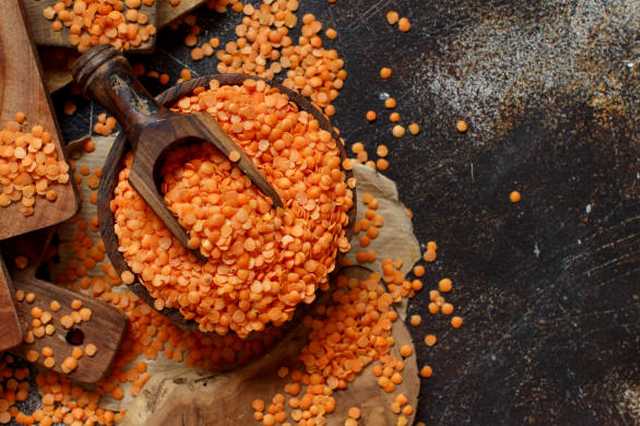 300g de lentilles corail (oranges), 2L de bouillon de légumes, 1 oignon haché, 1 gousse d’ail hachée, 3 carottes coupées en rondelles, sel, poivre, thym, huile d’olive.