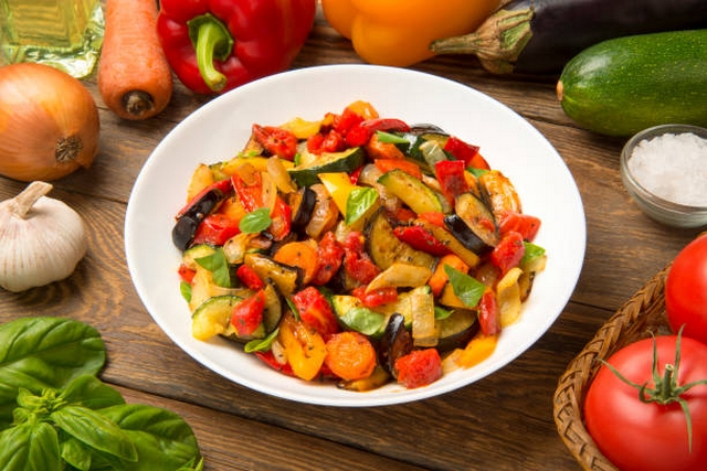 Verser la ratatouille froide dans un saladier. Ajouter les pignons de pin et les raisins. Dans un bol, préparer la sauce en mélangeant l’huile d’olive, le basilic et le curry, puis ajouter un peu de sel et de poivre. Verser la vinaigrette sur la ratatouille. Mélanger et déguster.