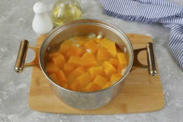 Faire chauffer l’huile et rissoler l’oignon. Lui ajouter le potiron coupé en dés, le bouillon végétal, la gousse d’ail écrasée et l’assaisonnement. Faire cuire 30 min à la marmite à pression.
