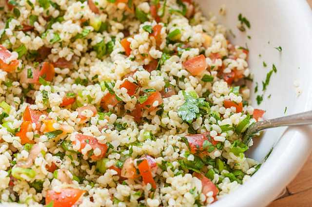 130g de Boulgour, 185mL d'eau, 150g de persil frais, 30g de ciboulette fraîche, 75g de basilic frais, 10g de menthe fraîche, 4 oignons nouveaux finement hachés, 3 tomates moyennes hachées, 80mL de jus de citron, 60mL d'huile d'olive, sel