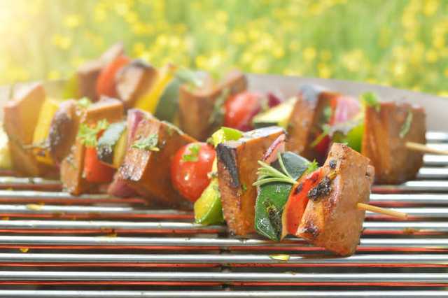 Pour le seitan : 150g de poudre de gluten, 1 càt de curry, 1 càs de moutarde, 1 càs de sauce de soja, 1 verre d’eau. Pour le bouillon : 1 cube de bouillon de légumes, 2L d’eau, 1 feuille de laurier, romarin, thym. Pour la marinade : 4 càs d’huile d’arachide, origan, thym, romarin, piments séchés, paprika. Pour les brochettes : 1 poivron jaune en dés, 1 poivron vert en dés, 2 oignons en pelures, tomates cerise.