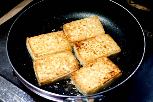 Faire mariner le tofu dans la sauce de soja et la moutarde (2 h.) Panez le tofu dans la farine mélangée au paprika et au poivre, et les faire griller des deux côtés à la poêle dans de l’huile. Ce tofu pané est délicieux avec une salade verte et des pommes de terre nature.