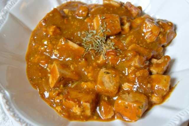 1 bloc de tofu coupé en cubes, 3 gros oignons en minces rondelles, 250mL de bouillon végétal, 1 càs de sucre brun, 2 càs de farine, 2 càs de bouquet garni séché, sel, poivre, huile d'arachide.