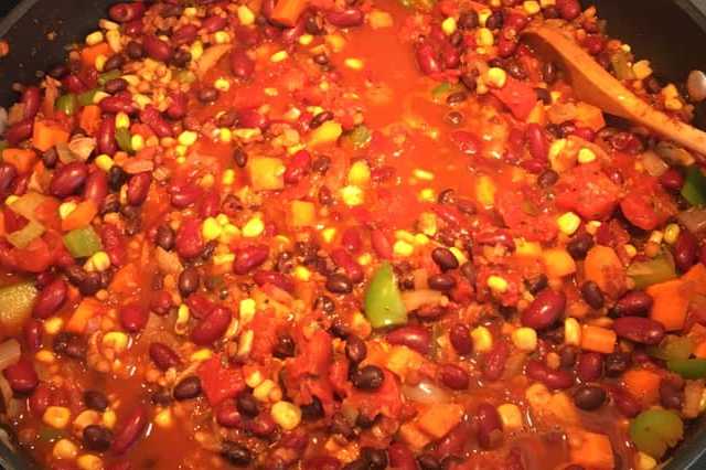 350g à 450g de fèves rouges cuites, 1 oignon, 8 champignons coupés en quatre, 2 carottes coupées en tranches, 500mL d’eau, 125mL de purée de tomates concentrée, 100mL de vinaigrette, fines herbes, tomates et basilic, 1 càs de thym séché, 30g de persil frais haché.