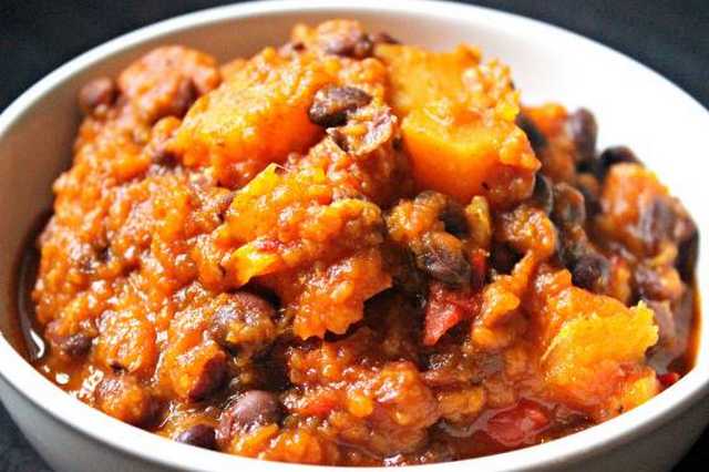 3 càs huile d’olive, 3 oignons moyens hachés, 1 càs poudre Chili, 1 càs cumin en poudre, 0,25 càt poivre de Cayenne, 2 poivrons découpés en dés, 3 gousses d’ail, 1kg de tomates découpées en morceaux, 250mL d’eau, 500g de haricots rouges cuits et rincés, 500g de haricots noirs cuits et rincés, 350g de maïs en grains, 70g de bulgur (blé concassé), sel et poivre, coriandre verte.