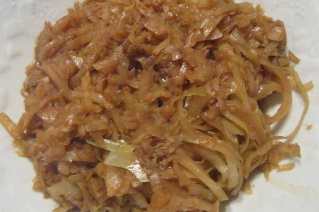 800g de chou blanc ou vert, 2 gousses d'ail, 1 oignon, 3 càs d’huile d'olive, 3 càs de sauce de soja, 2 càs d’huile d’arachide, 1 càt de sucre, 0,5 verre de bouillon de légumes, 0,5 càt d'huile de sésame aromatique, sel et poivre.