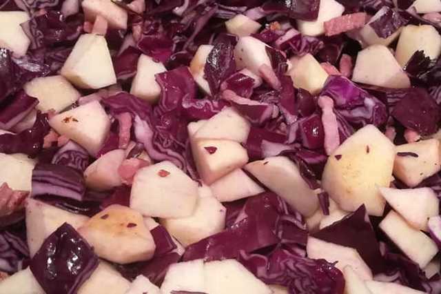 Dans une cocotte : faire revenir les oignons dans de l'huile d'olive, puis le chou rouge coupé en lamelles. Ajouter un peu d'eau en cas de besoin. A mi-cuisson, ajouter les châtaignes. 5 min avant la fin de la cuisson : ajouter les pommes coupées en morceaux. Saupoudrer de sel, poivre et herbes de Provence. Mettre le couvercle et laisser finir de cuire. A consommer avec du riz ou une autre céréale ou avec des pommes de terre.
