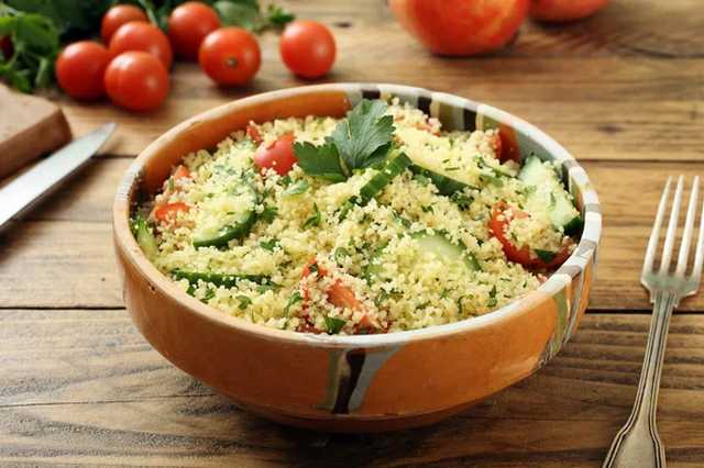Mettre le couscous dans un saladier et recouvrez-le d’eau très chaude. Laisser-le gonfler quelques min. Pendant ce temps, préparer une sauce avec la moutarde, l’huile et le jus de citron. Ajouter-y les échalotes émincées finement et la menthe hachée. Débitez les tomates et l’avocat en petits morceaux. Mélanger le tout et servir frais.
