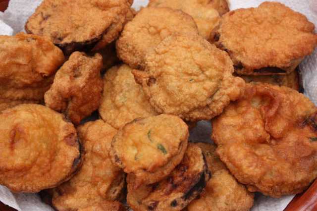 1 grosse aubergine, 1 càs de sel, 2 càs de farine de pois chiches + 50g supplémentaire, 1 pincée de poivre, 30g de farine avec levure incorporée, 60mL d'eau, 2 càt de jus de citron, 170mL d'huile d'olive. Sauce au yaourt de soja : 200g de yaourt de soja nature, 2 càs d'oignon finement ciselé, 0,5 càt de menthe séchée, 0,5 càt de sel, 0,5 càt de coriandre moulue, pincée de cumin moulu.