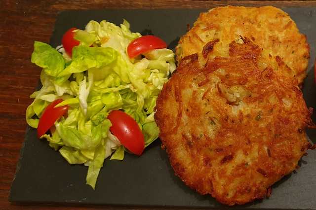 Peler les pommes de terre et les oignons. Râper-les grossièrement avec une râpe en inox. Dans un récipient, mélanger les pommes de terre et oignons râpés, l’ail et le persil hachés. Saler, poivrer. Faites chauffer un peu d’huile dans une grande poêle. Verser-y la préparation, la faire cuire et dorer des deux cotés. Vérifier que les pommes de terres soient bien cuites. Servir la galette accompagnée d’une salade