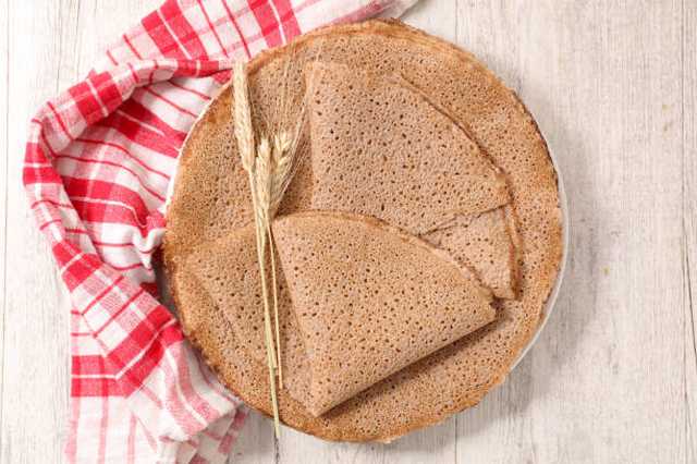 2 càs de farine de blé, 350g de farine de sarrasin, sel marin, muscade, 1L d'eau, 1 càs de farine de soja