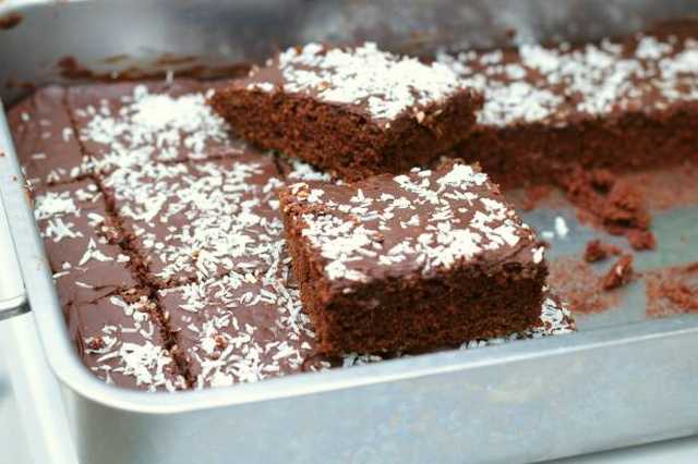 180g de sucre brun, 150g de chocolat noir, 0,5 tasse d’eau, 2 càt de fécule de maïs, 80g de margarine végétale, 90g de farine, 90g de noix de coco râpée, 1 sachet de sucre vanillé, 2 càs de cacao, 1 càs de sucre glace.