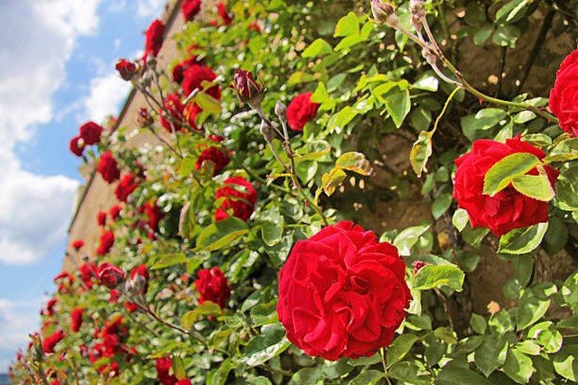 Rosiers grimpants : ou sarmenteux car les rameaux sont palissés le long des murs, des grillages et des treillis. Les rosiers grimpants fleurissent sur le jeune bois c'est-à-dire sur les rameaux non ramifiés qui se sont formés l'été précédent. Lorsque ces rameaux sont nombreux, tous les autres rameaux peuvent être supprimés. Si ce n'est pas le cas, raccourcir toutes les branches latérales (un ou deux yeux suffisent). Les sujets anciens, déjà grands, devront être détachés complètement; après la taille, palissez-les de nouveau. La taille doit être annuelle, sinon le rosier finira par fleurir seulement sur la partie supérieure et il vieillira beaucoup plus vite. Les soins d'entretien jouent donc un rôle important.